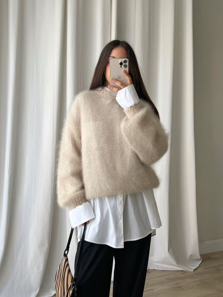 Maglione girocollo in 80% kid mohair morbidissimo, colore beige chiaro.