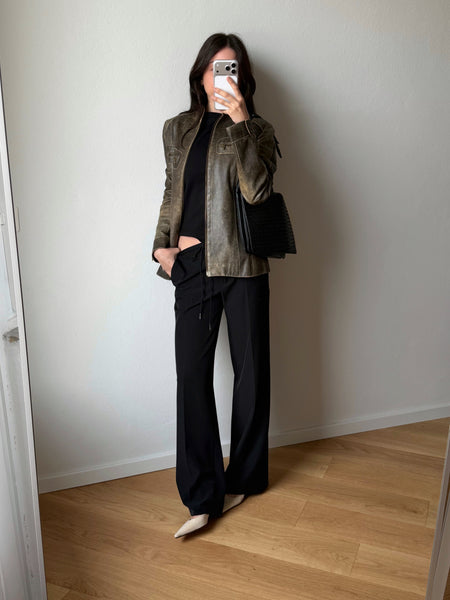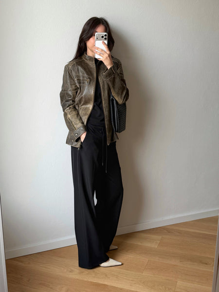 Nappa morbidissima al tatto con effetto distressed, super attuale e di tendenza. Fit dritto, asciutto e minimal. Cerniera con doppio cursore molto 90s. Collo alla coreana, taschine frontali e fodera interna. Un capo made in Italy.