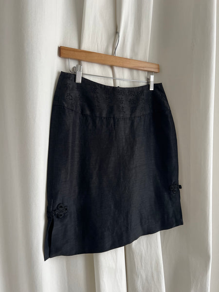 Feature: mini in misto seta firmata Blunauta, con motivi orientali jaquard tono su tono e alamari a chiudere gli spacchetti laterali. Foderata con tessuto in pura seta. Una chicca!