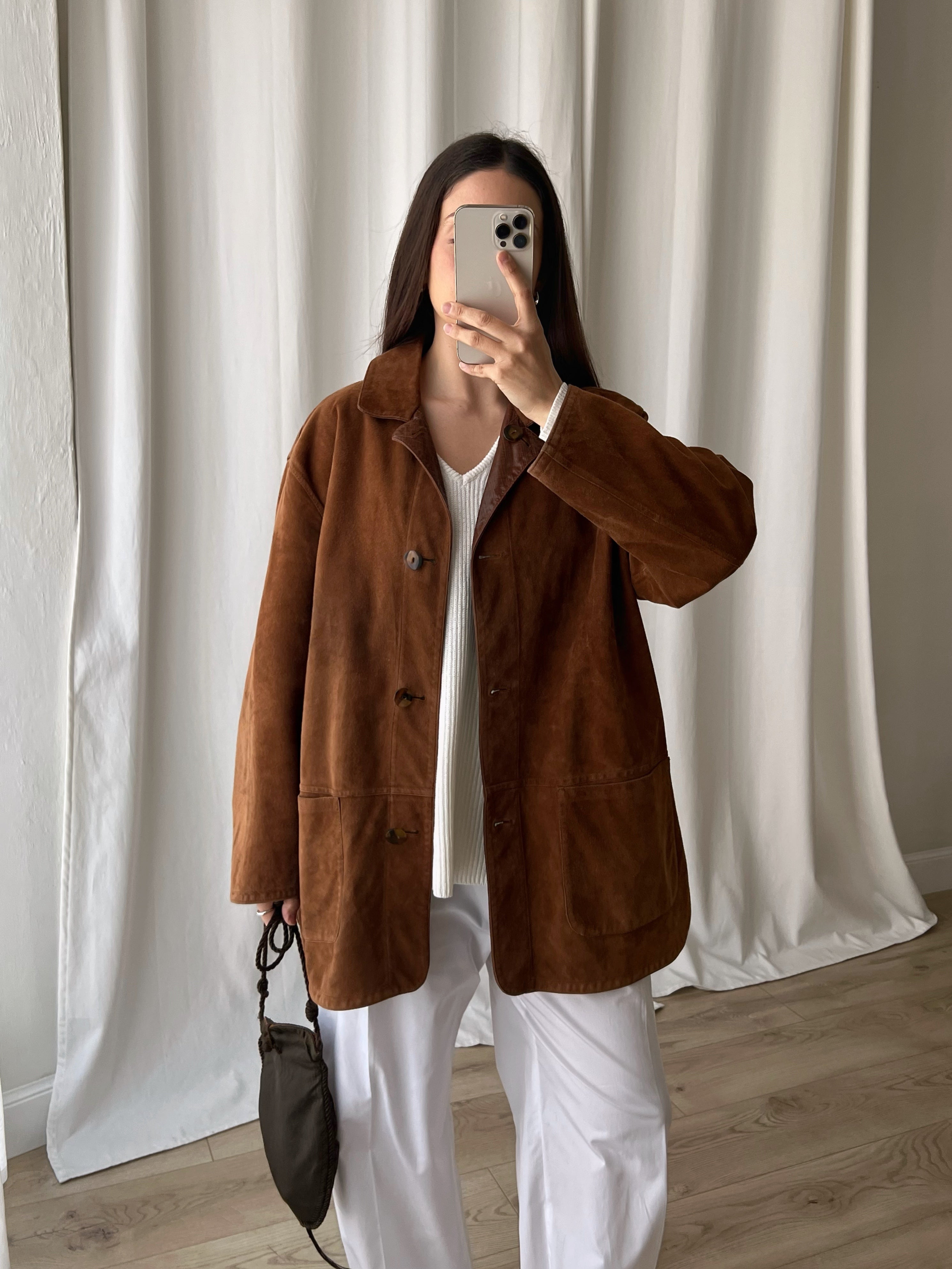 Feature: un classico per la mezza stagione, vintage ma attuale e di tendenza. Realizzato con un camoscio super morbido e di alta qualità. Fit over molto bello. E' un capo reversibile con un lato in pelle spalmata semi lucida, quindi avrete due giacche in una!